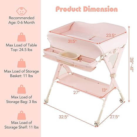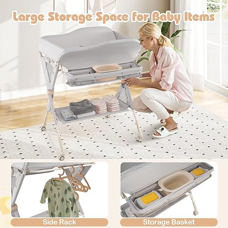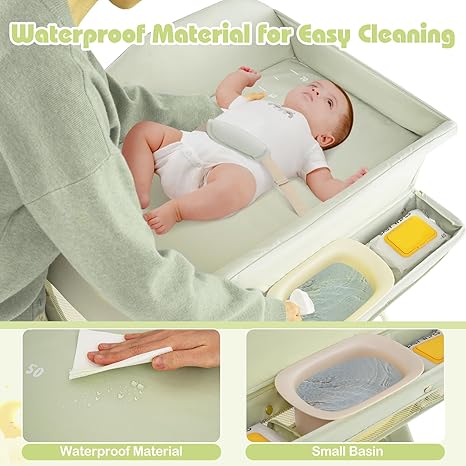 Premium Safety Material: The changing table stand features a sturdy X-shaped frame design for increased stability. Meanwhile, the 4-side protective cloth panels and safety belt provide absolute security for babies. The diaper changing table top has been treated with waterproof for easy cleaning. This diaper changing table comes with a small water basin