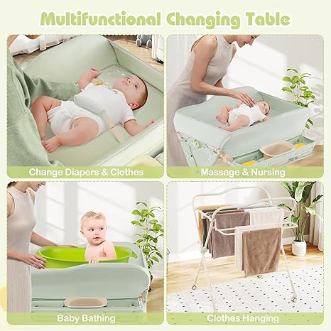 Large Storage Space: This diaper changing station is equipped with a bottom shelf for storage, as well as basket and a hanging rod on each side for placing items such as diapers, towels and tissues. Furthermore, it can be used as a clothes drying rack after removing the cover. This portable changing station allows parents to maximize its utility