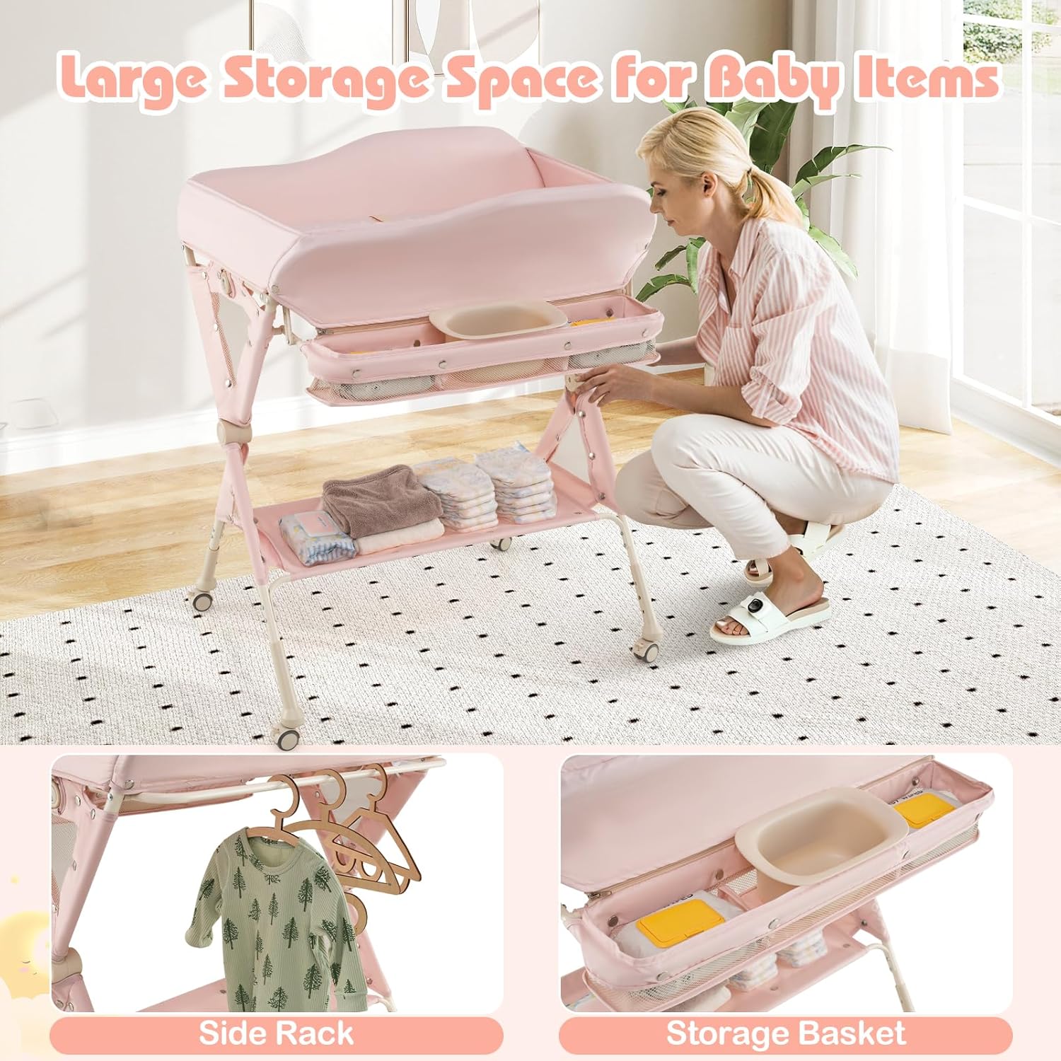 INFANS Baby Changing Table with Wheels, Portable Folding Diaper Station Nursery Organizer with Storage Basket, Hanging Rack, Adjustable Height, Safety Belt for Newborn Infant