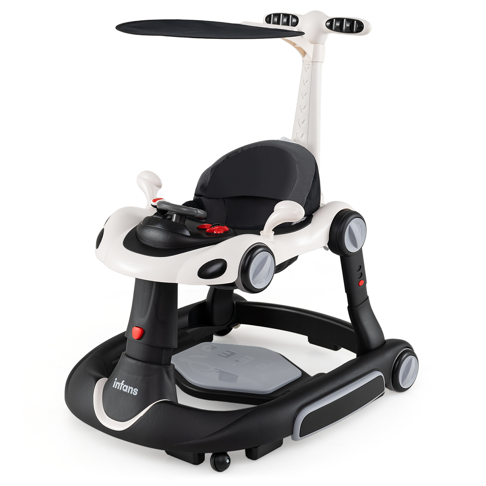 Detachable Play & Dine Tray: The panel features a steering wheel, gear shifter, roller toy, and music & light buttons that help sensory and motor development. Remove it entirely to turn the activity walker into a feeding chair