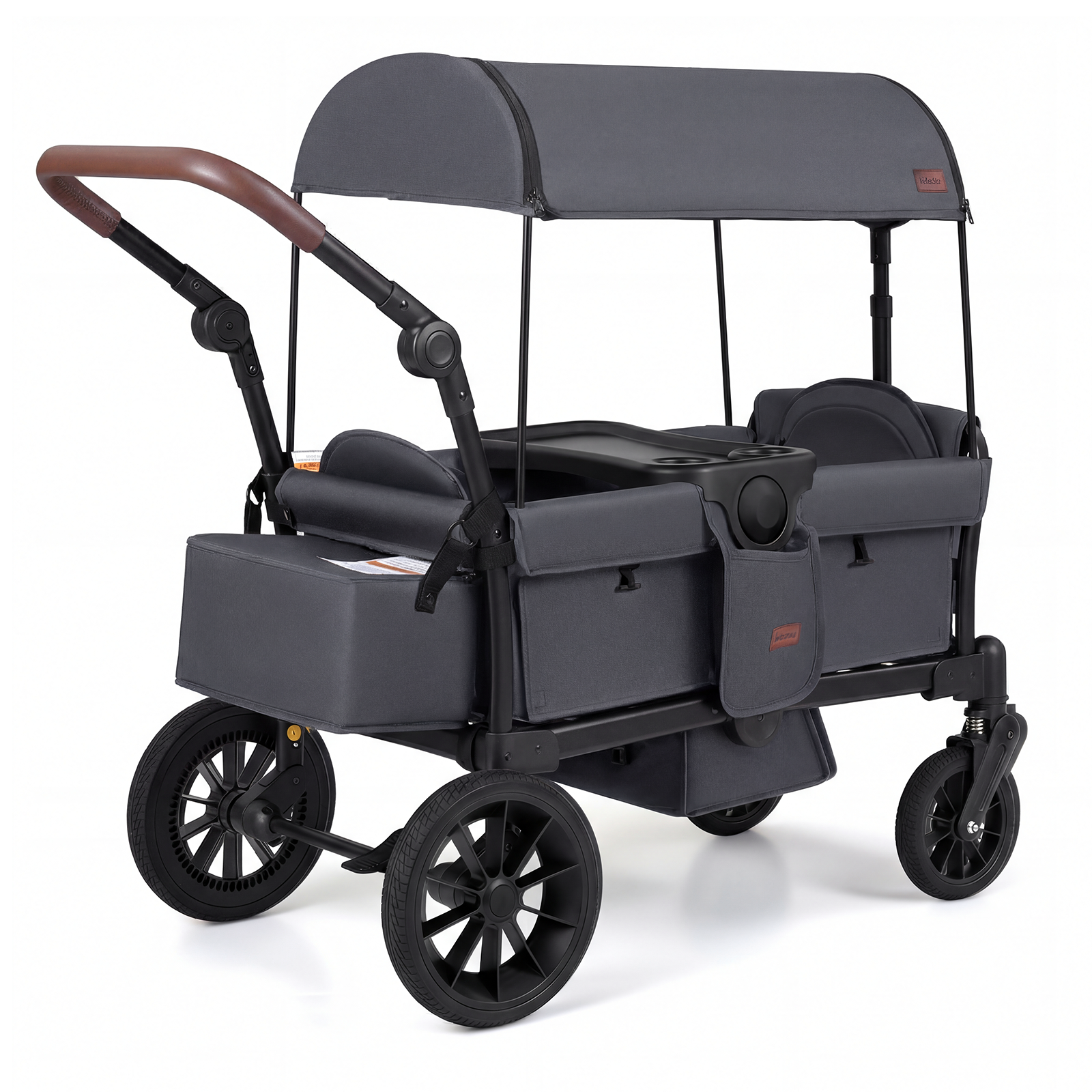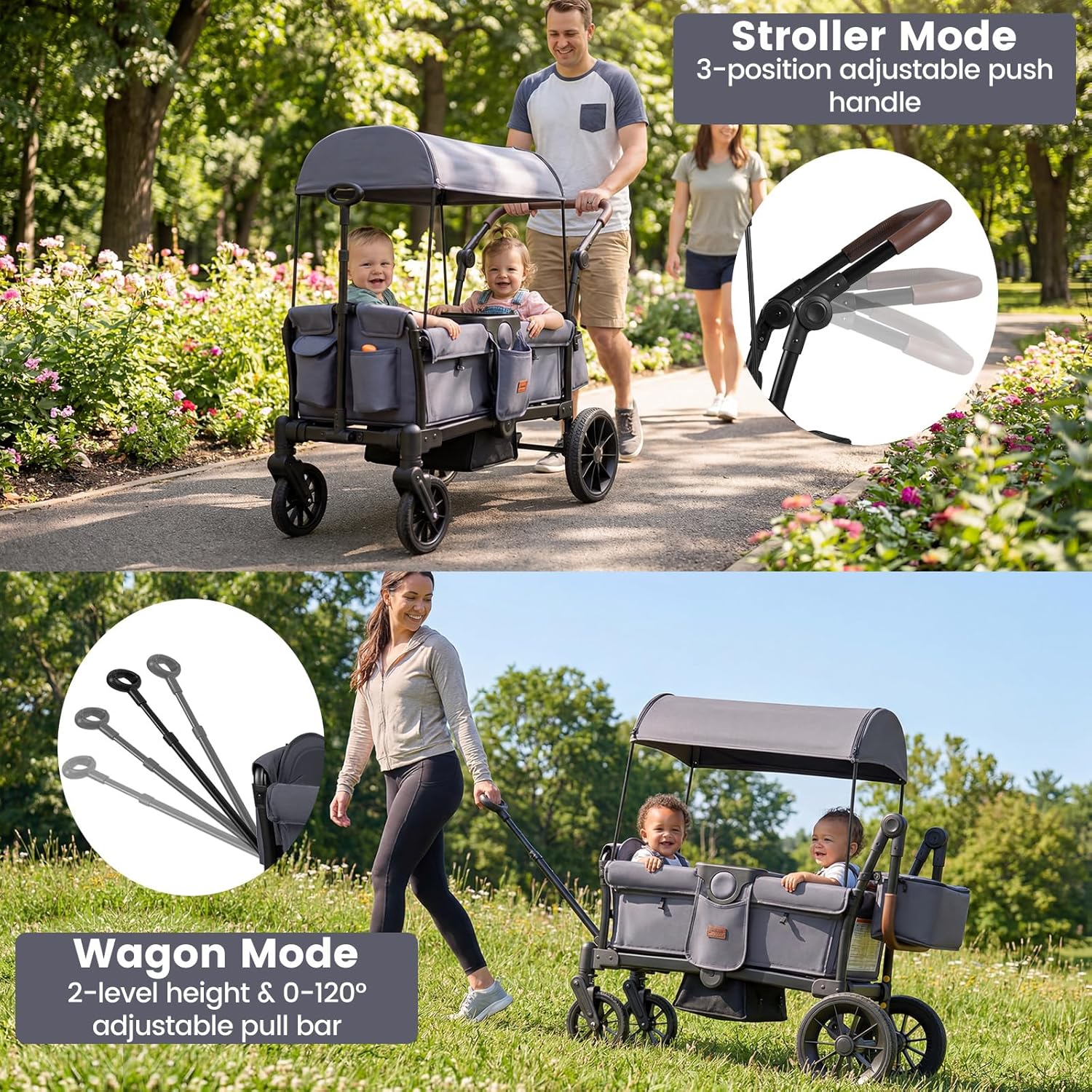 Personalized Handling & Control: This stroller wagon for 2 kids includes a 2-position adjustable leather push handle and a pull bar with 0-120°angle plus 3-length settings, adapting to various scenarios and user heights