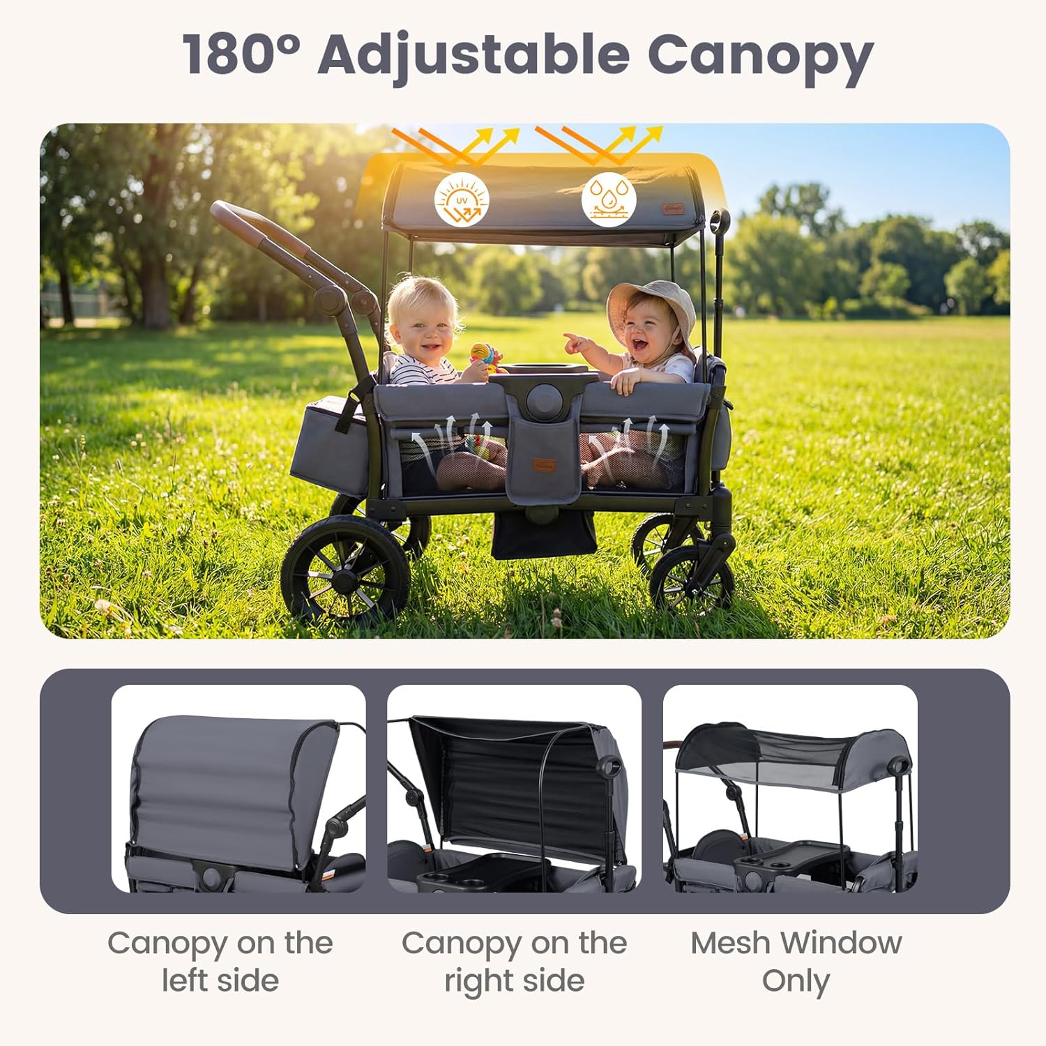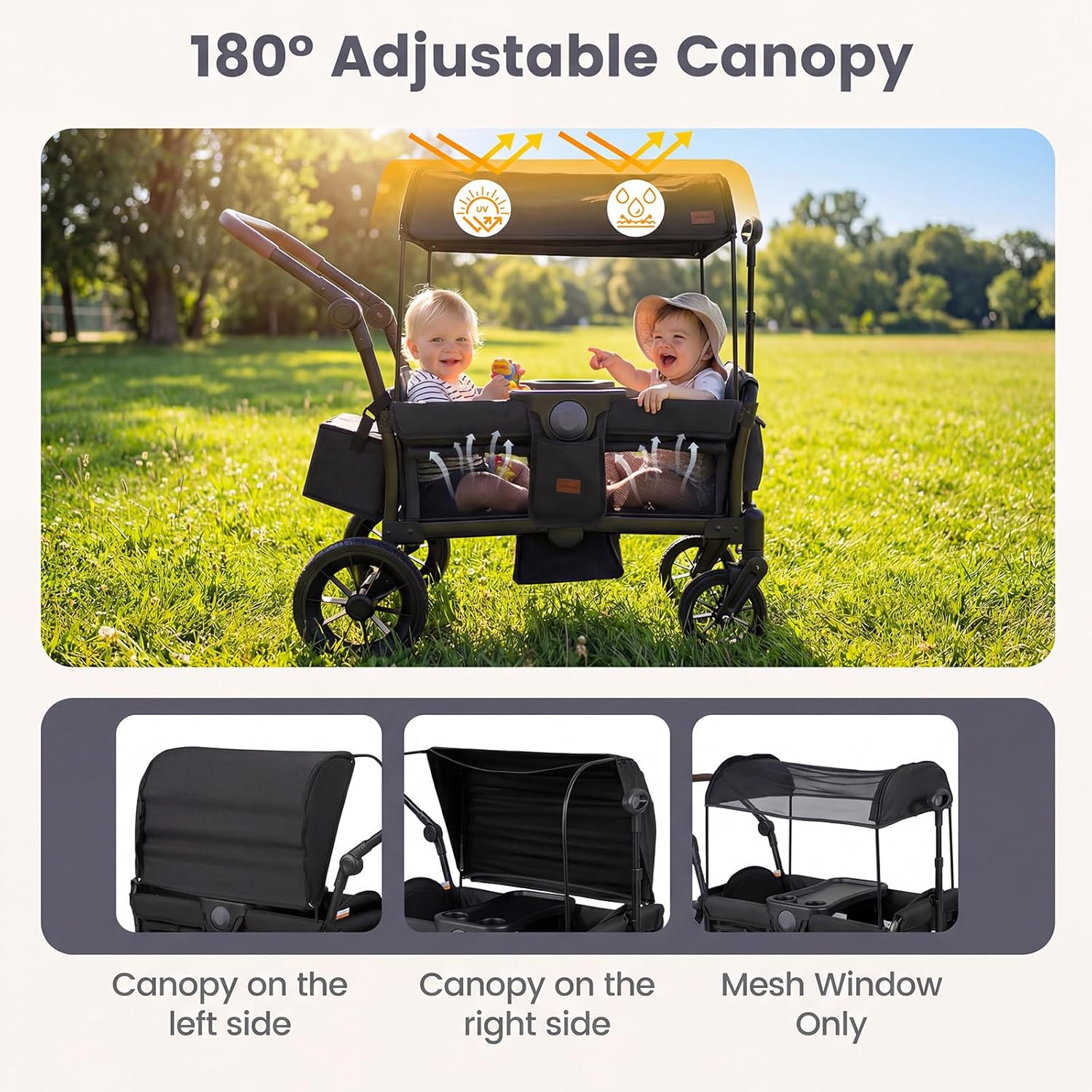 Adjustable Canopy: The removable canopy on this kids wagon provides UPF 50+ and 180°full sun protection, and can be converted to a mesh window—paired with breathable side panels to keep kids cool and dry during outdoor fun