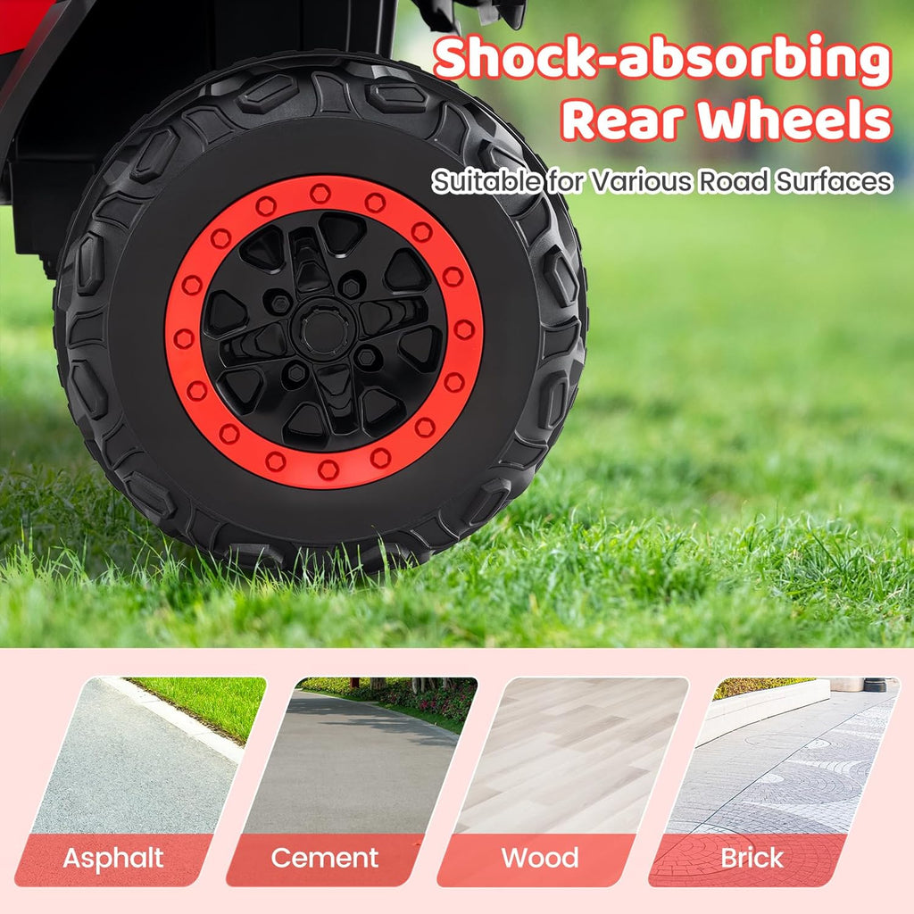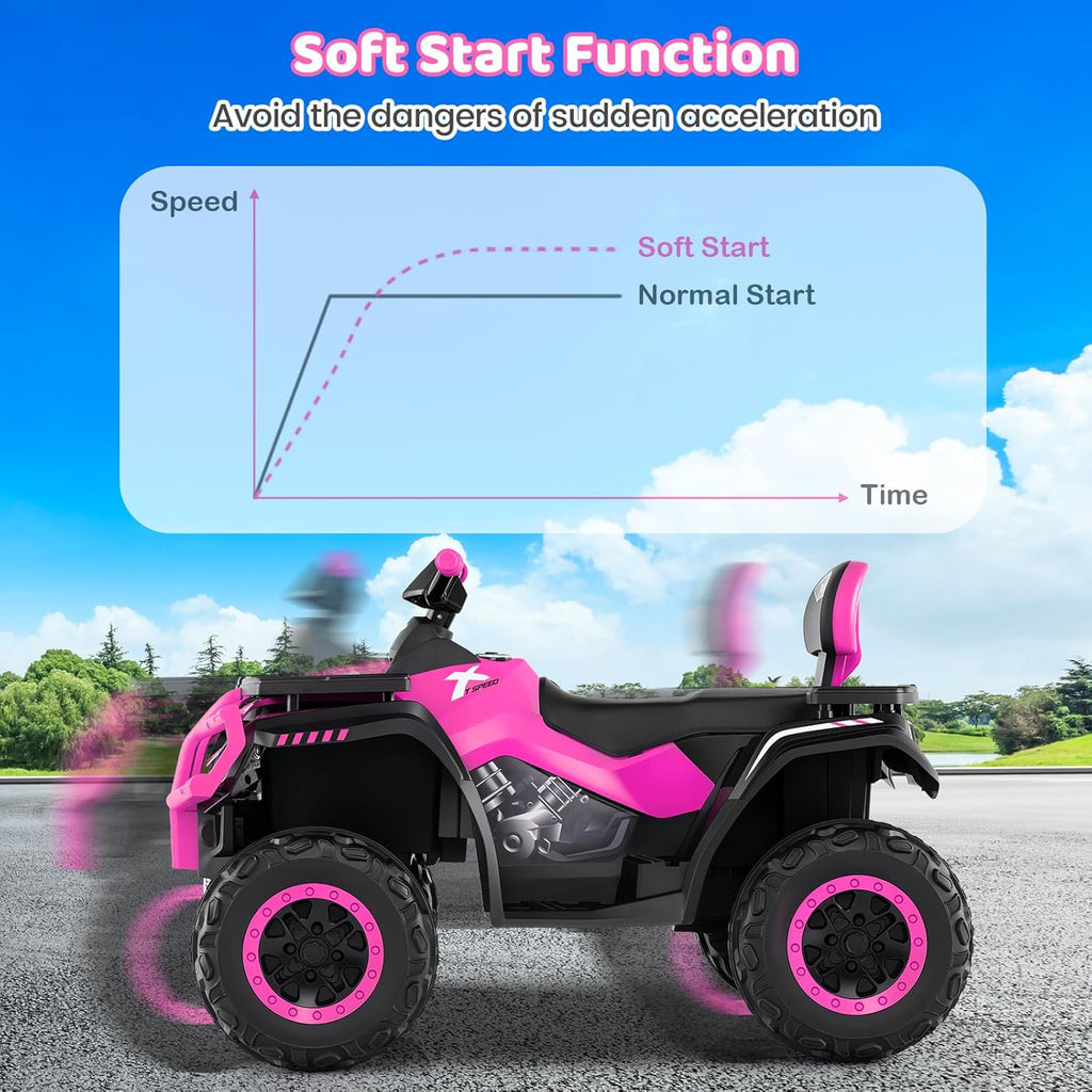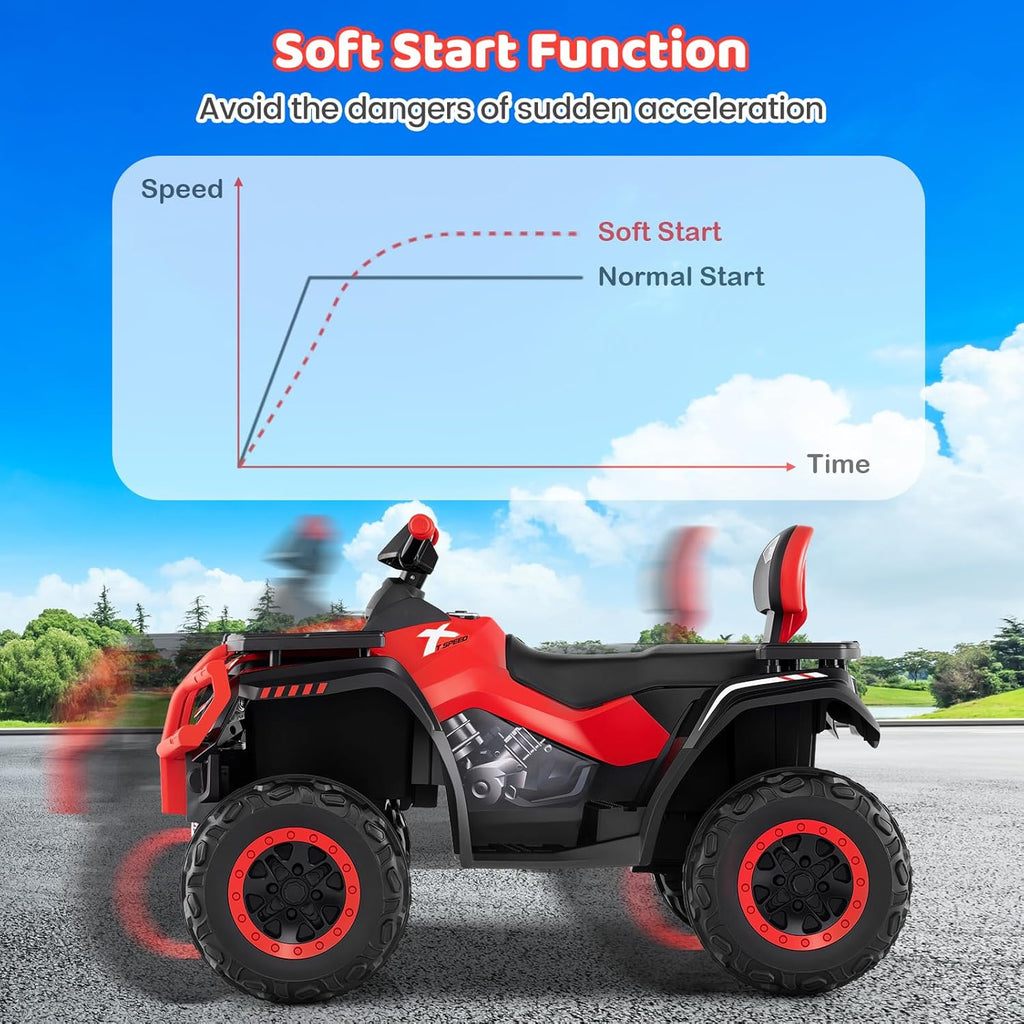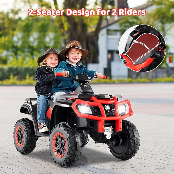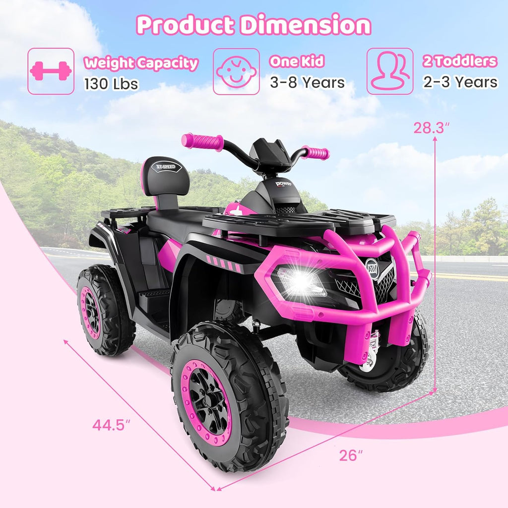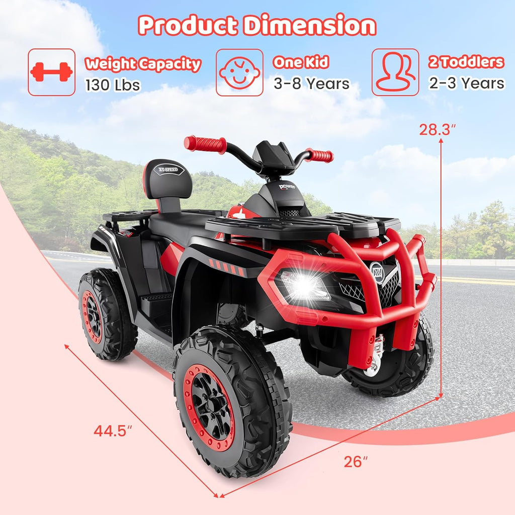 Spacious 2-Seater Design: The extra large 2-seater design fits 2 children aged 2-3 or 1 child aged 3-8. The supportive backrest enhances comfort and safety. The max weight capacity of this kids ATV 4 wheeler is 130 lbs