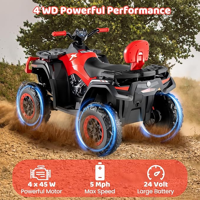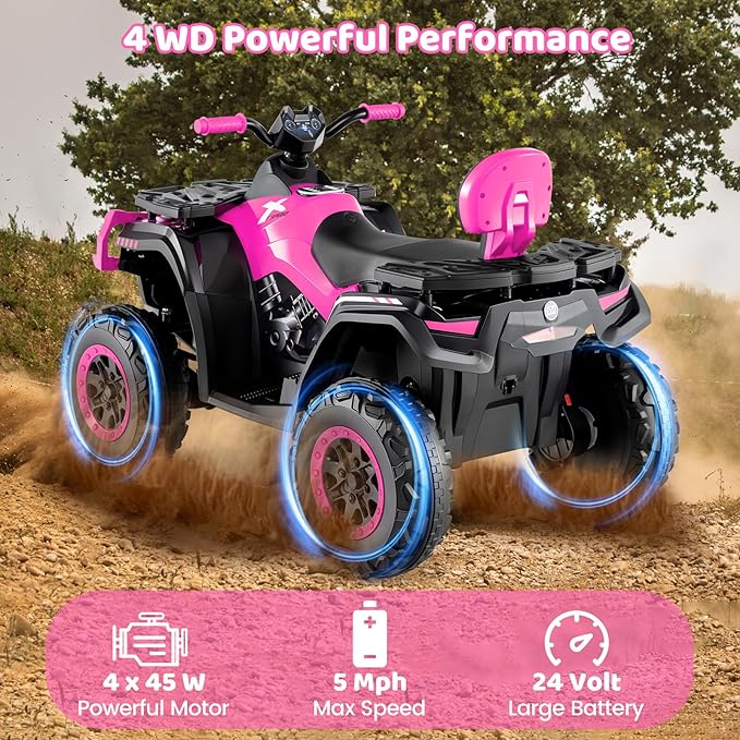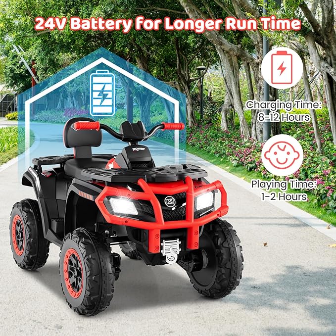 24V & 4WD Powerful Motor: OLAKIDS kids ATV equipped with a 24V 7AH battery and 4WD motors, offering strong power. It can reach up to 5 mph with great hill-climbing ability. After an 8-12 hour charge, it lasts about 1-2 hours, perfect for kids' play