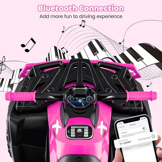 Multiple Built-in Fun: OLAKIDS 24v ride on toys for big kid includes music, USB, Bluetooth, Radio, and volume control. Kids can drive while listening to their favorite songs. A power display shows battery status