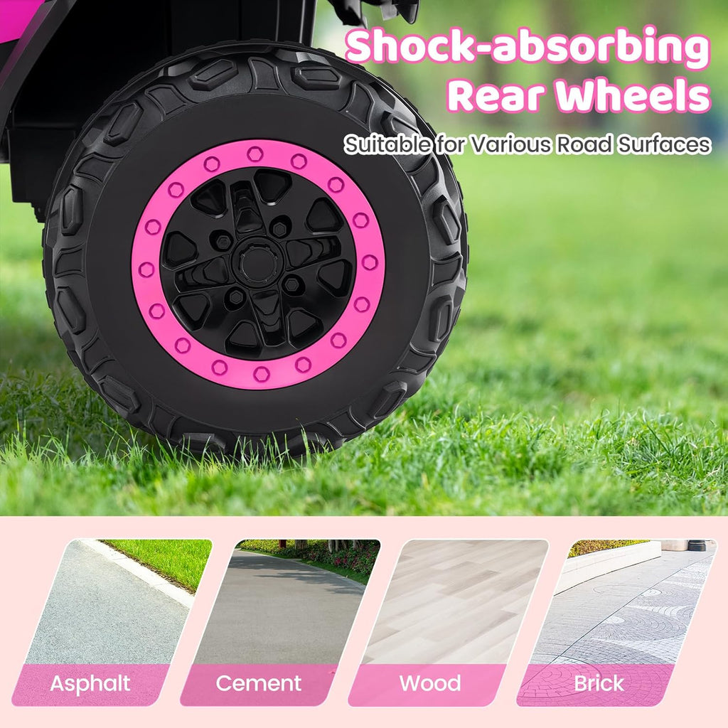 Safe Driving Function: Soft start and soft brake functions ensure a smooth ride. Durable all-terrain wheels with suspension springs absorb shocks, providing a safe and comfortable experience even on uneven terrain