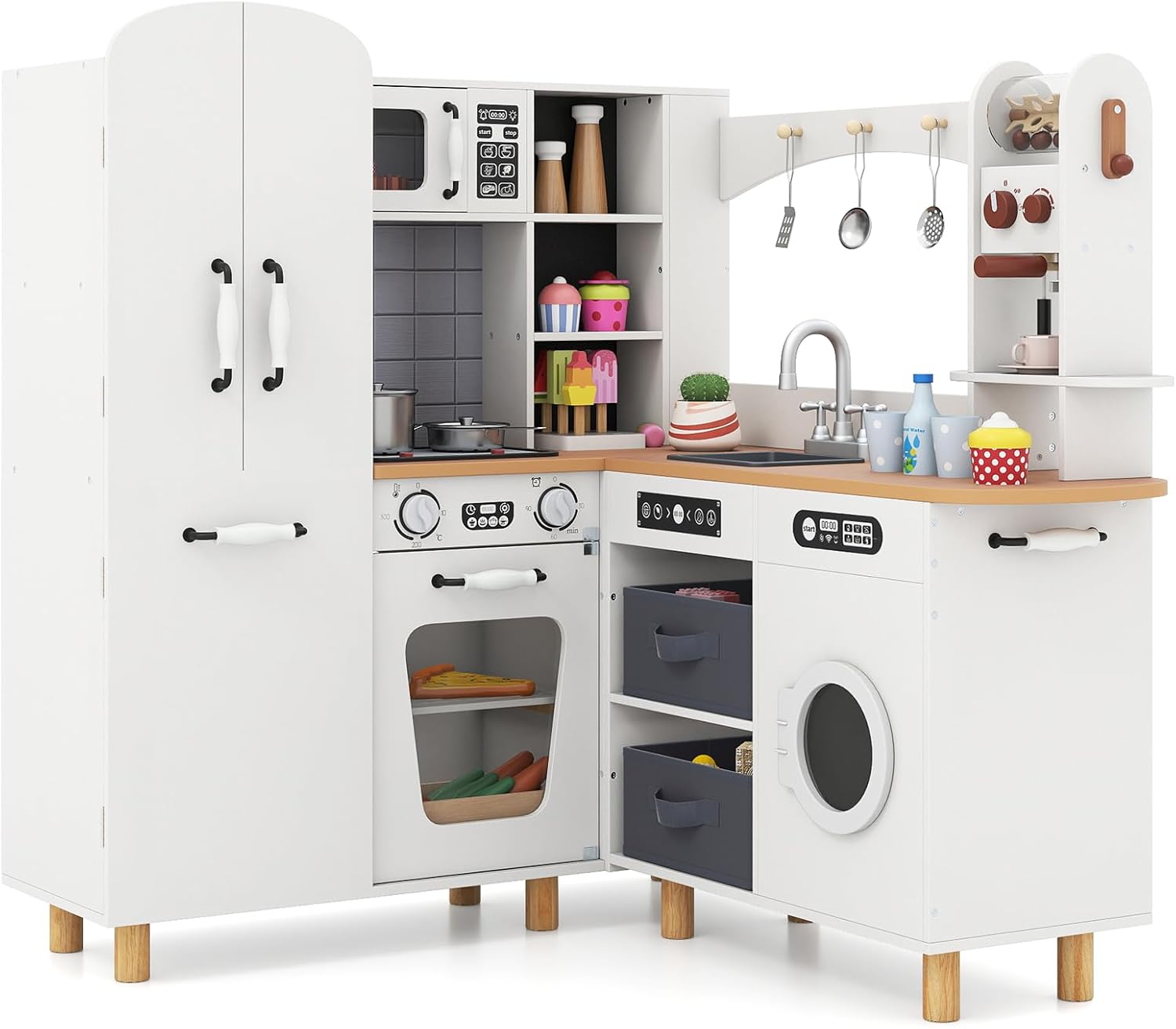 INFANS Corner Kids Kitchen Playset, Toddler Wooden Pretend Cooking Set with Real Running Water Circulation Realistic Light Sound Stove Storage Cabinet Removable Sink Simulation Play Kitchen Toy