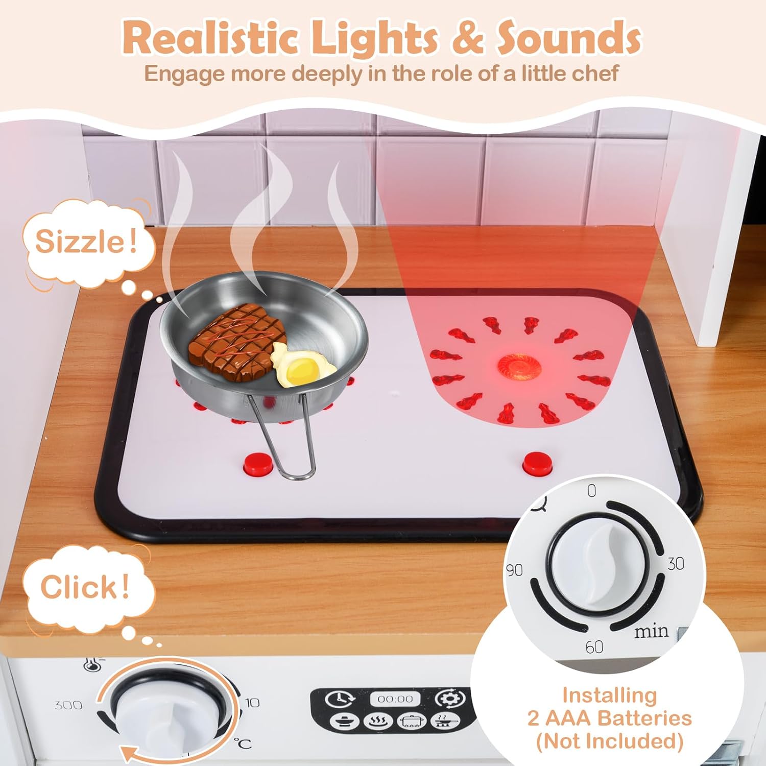 • Vivid Sound & Light: In order to give little one with an immersive cooking experience, the range hood and steam stove have realistic sound and light effects. When children turn the knob, it makes sounds and lights. Note: 6 × AAA battery (not included).