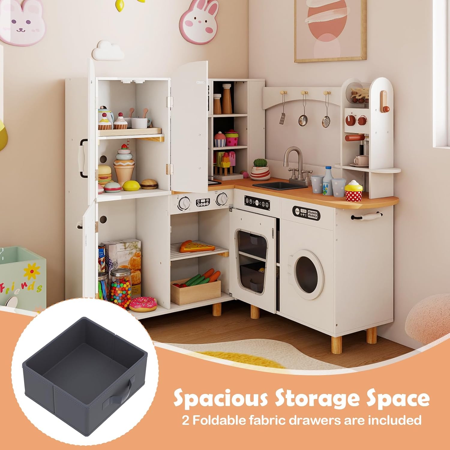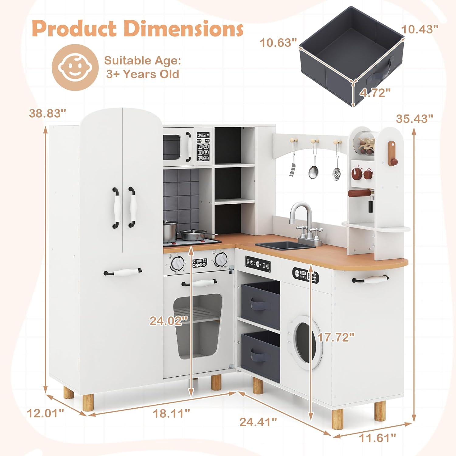 • Extreme Large Storage Space:This sophisticated kids corner cooking set comes with 5 multi-tiered cabinets with doors and corner shelves in the back. The 3 shelves above the counter provide plenty of space for the children to place the spice bottles. In addition, 2 storage baskets fit well into compartments or are used alone.