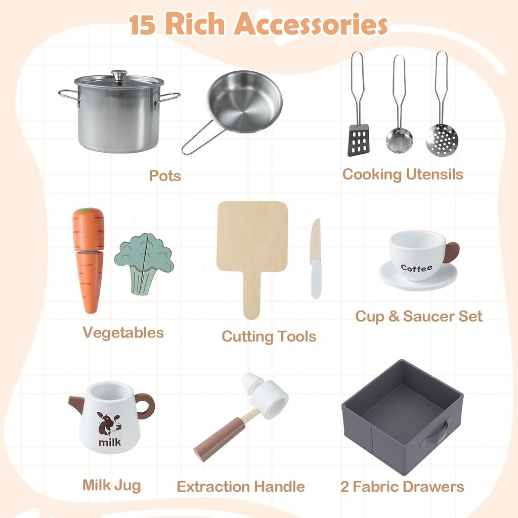 • Role-Playing Fun: This wooden pretend kitchen allows children to share the fun of exploring the kitchen with their peers by role-playing, and also provides a great opportunity for children to practice their language and social skills. The little chef can put on an apron and write the menu of the day on the blackboard. Then call the friends to eat through the telephone.