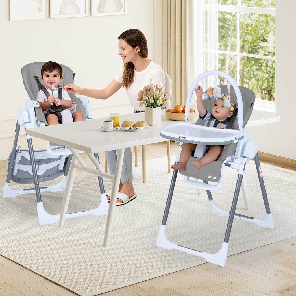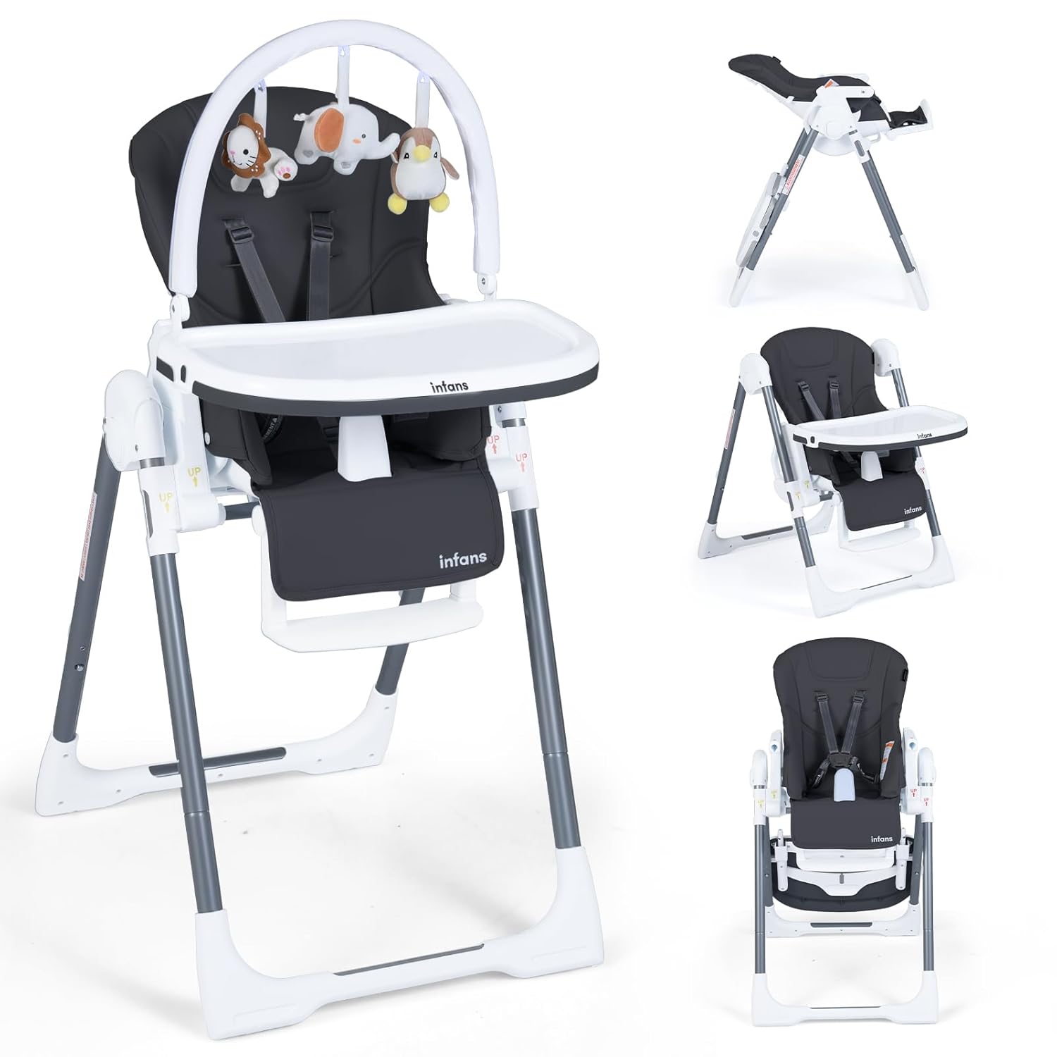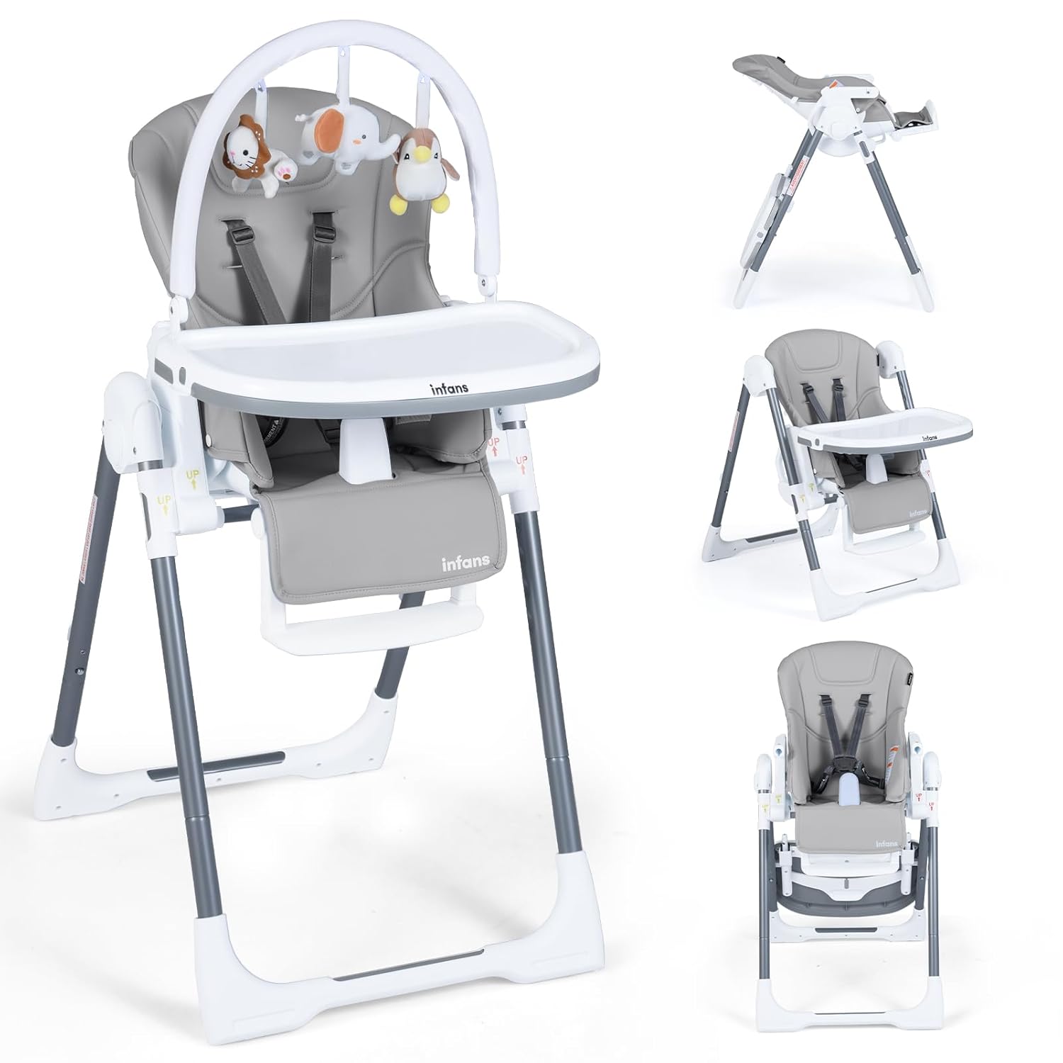 INFANS High Chair for Babies and Toddlers, Foldable Highchair with 7 Different Heights 4 Reclining Backrest Seat 3 Setting Footrest, Removable Tray Built-in Rear Wheels with Locks