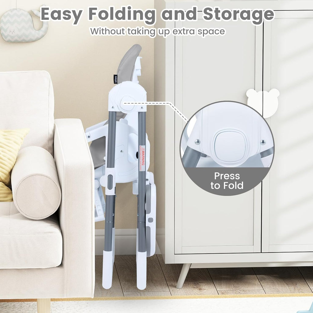 • FOLDABLE & SPACE SAVING: With a one-click foldable button, you can fold the high chair into a compact size for easy transportation and storage. The folded high chair can stand without additional support. Removable trays can be attached to the legs to save space. In addition, the built-in wheel with brakes makes the baby dining chair more convenient to move.