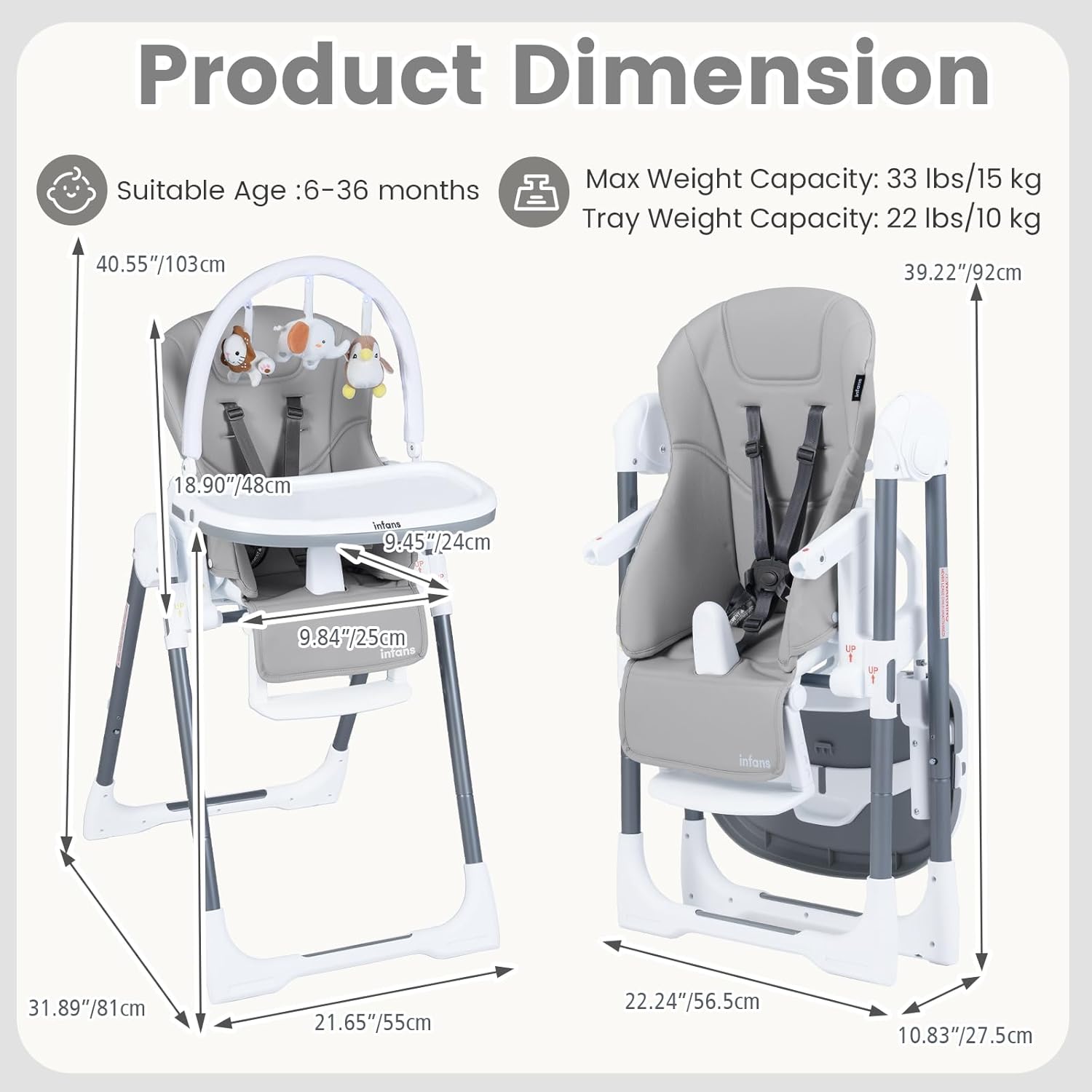 • HIGH CHAIR WITH MULTIPLE ADJUSTABLE: INFANS baby highchair has 7 height positions and can match dining tables or sofas of different heights. The 3 position backrest adjustment allows your baby to learn to eat, The 3 positions and 3 retractable footrest are suitable for infants and toddlers of different heights and ages.