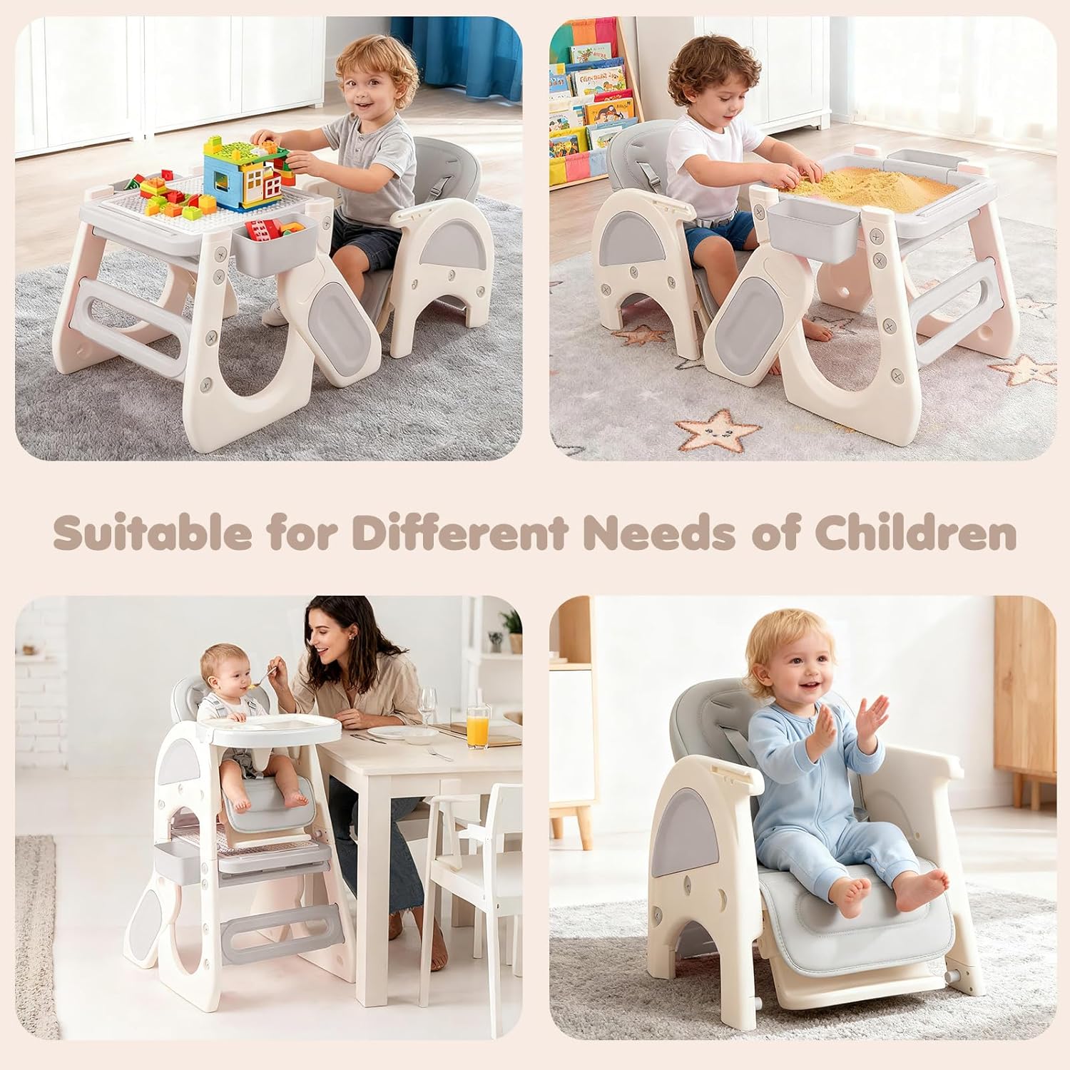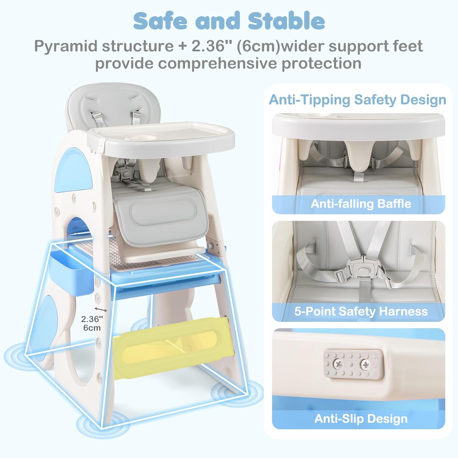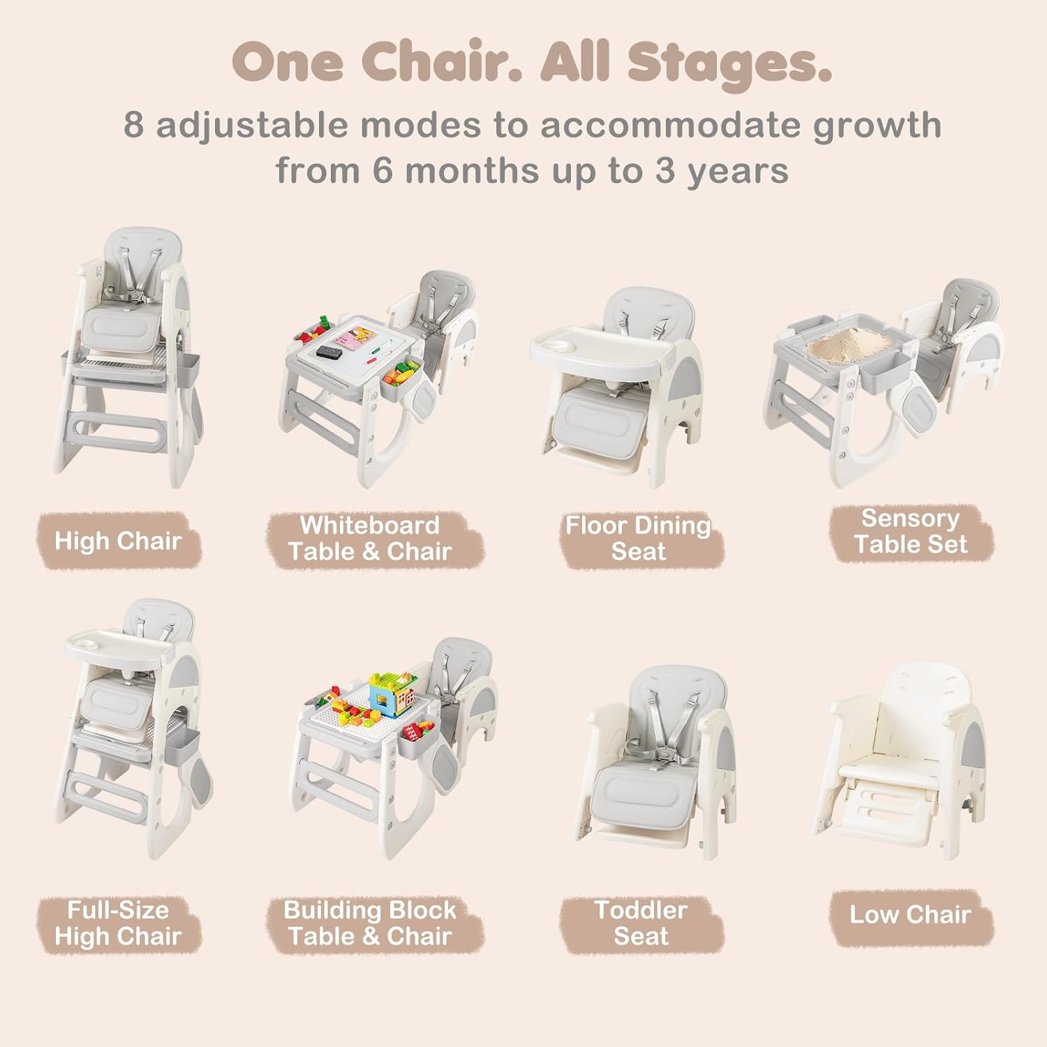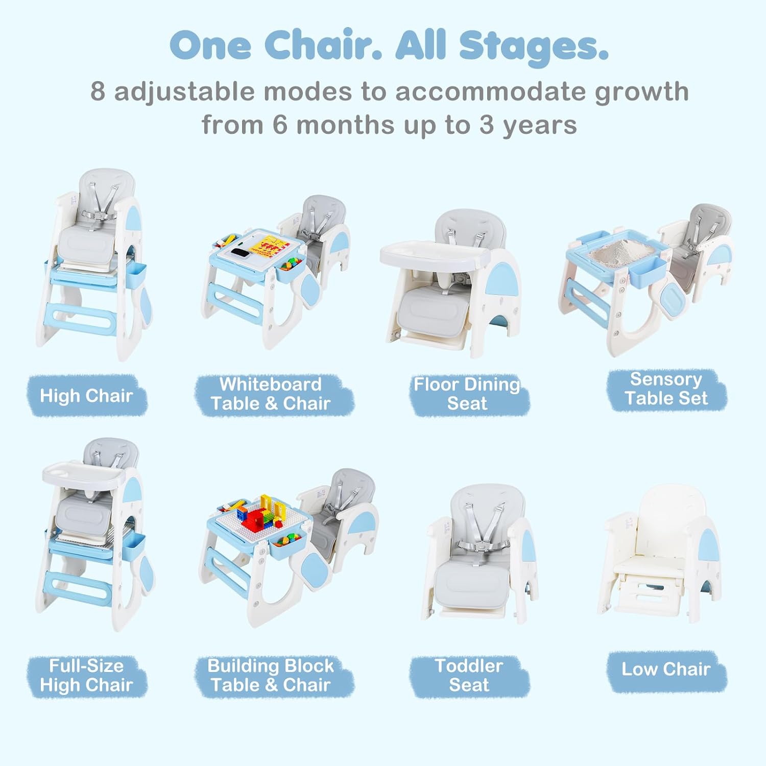 About this item 8 in 1 Convertible High Chair: OLAKIDS convertible high chairs can convert from a full-sized high chair to a toddler table and chair set. Includes multiple uses such as feeding chair, toddler chair, art table, building block table, and sensory play table—offering versatile functionality in one space-saving design. Reversible Tabletop: The whiteboard of the infant feeding chair can be used for writing and drawing and flipping it over instantly turns it into a building block board. There is a storage space under the board that can serve as a sand and water area. The small drawers on 2 sides can store small items. Adjustable Tray and Backrest: The baby eating chair features a double-layer tray and adjustable backrest to grow with your child. The removable, easy-to-clean trays make mealtime more convenient, while the adjustable backrest ensures comfort for babies and toddlers of different ages. Unwavering Safety for Baby: The pyramid structure design of the baby chair for eating effectively resists tipping. When paired with the an-slip foot pads at the bottom, it further enhances stability. Equipped with 5-point safety harness and fixed baffle, it can firmly secure the baby's body and prevent accidental slipping. Easy to Clean: Dishwasher-safe tray for high chairs baby and toddler, effortless cleaning. The seat cushion is made of waterproof PU material, allowing for simple wipe-downs. For deep cleaning, it can be removed and placed in the washing machine.