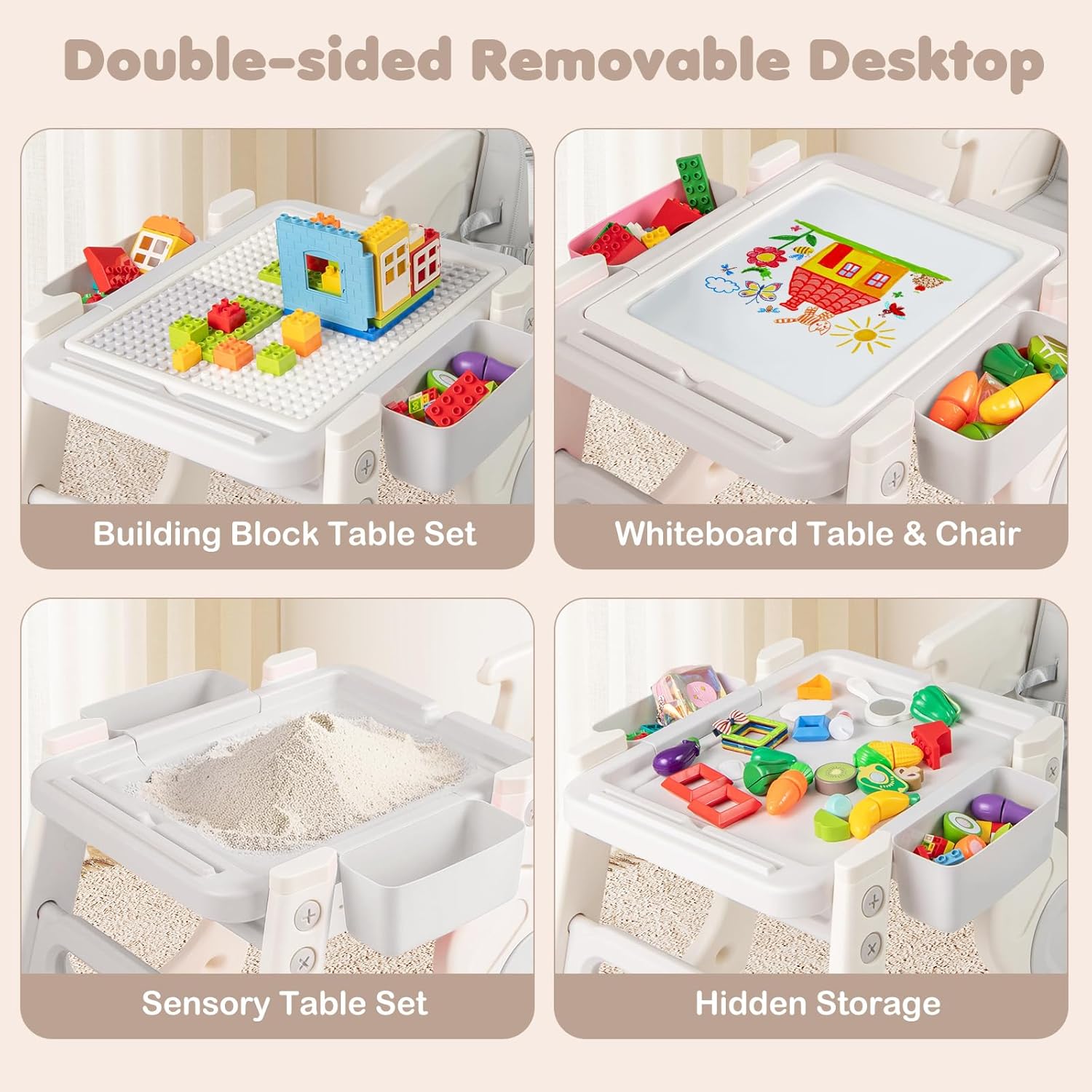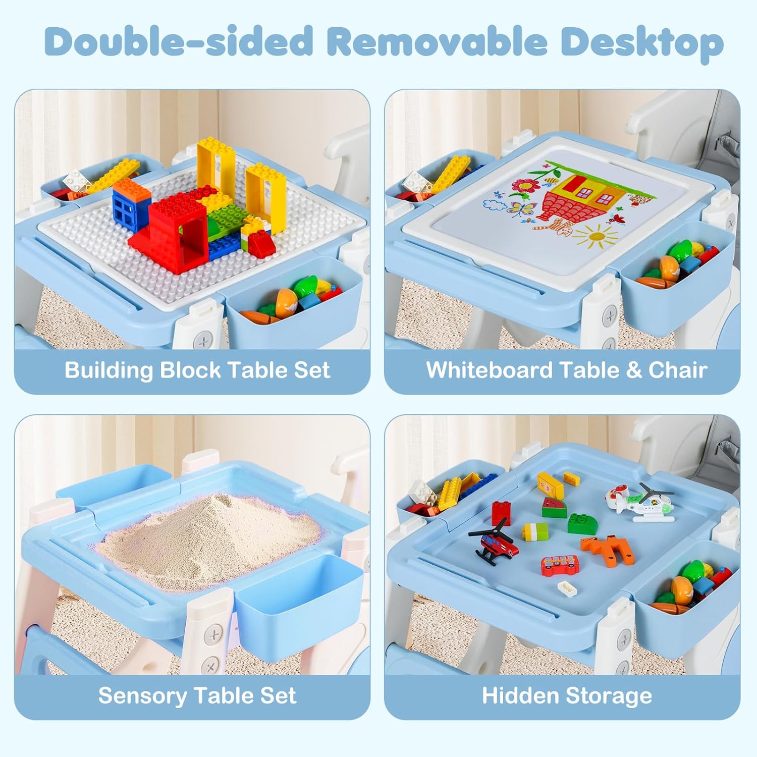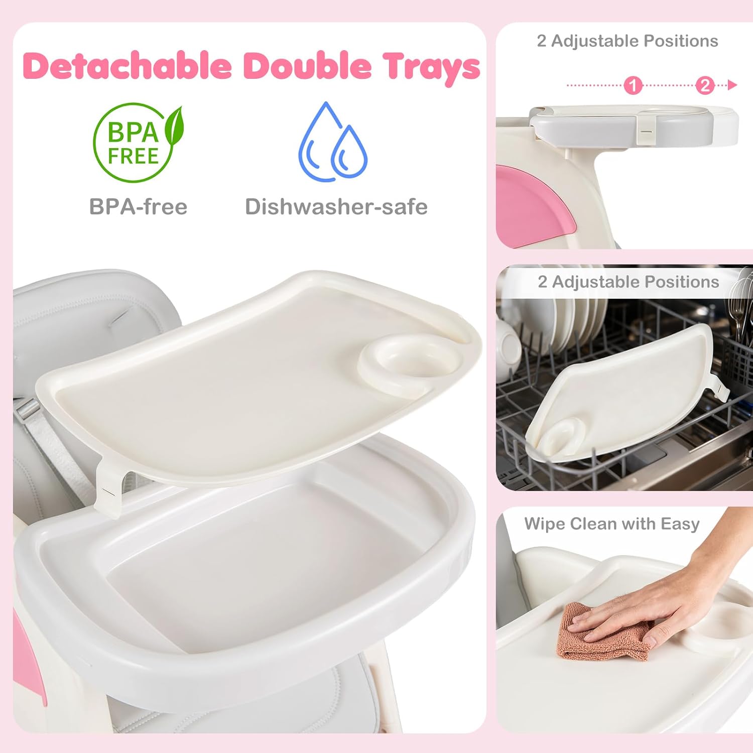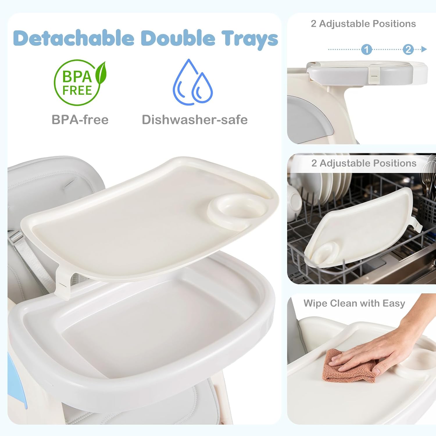 About this item 8 in 1 Convertible High Chair: OLAKIDS convertible high chairs can convert from a full-sized high chair to a toddler table and chair set. Includes multiple uses such as feeding chair, toddler chair, art table, building block table, and sensory play table—offering versatile functionality in one space-saving design. Reversible Tabletop: The whiteboard of the infant feeding chair can be used for writing and drawing and flipping it over instantly turns it into a building block board. There is a storage space under the board that can serve as a sand and water area. The small drawers on 2 sides can store small items. Adjustable Tray and Backrest: The baby eating chair features a double-layer tray and adjustable backrest to grow with your child. The removable, easy-to-clean trays make mealtime more convenient, while the adjustable backrest ensures comfort for babies and toddlers of different ages. Unwavering Safety for Baby: The pyramid structure design of the baby chair for eating effectively resists tipping. When paired with the an-slip foot pads at the bottom, it further enhances stability. Equipped with 5-point safety harness and fixed baffle, it can firmly secure the baby's body and prevent accidental slipping. Easy to Clean: Dishwasher-safe tray for high chairs baby and toddler, effortless cleaning. The seat cushion is made of waterproof PU material, allowing for simple wipe-downs. For deep cleaning, it can be removed and placed in the washing machine.
