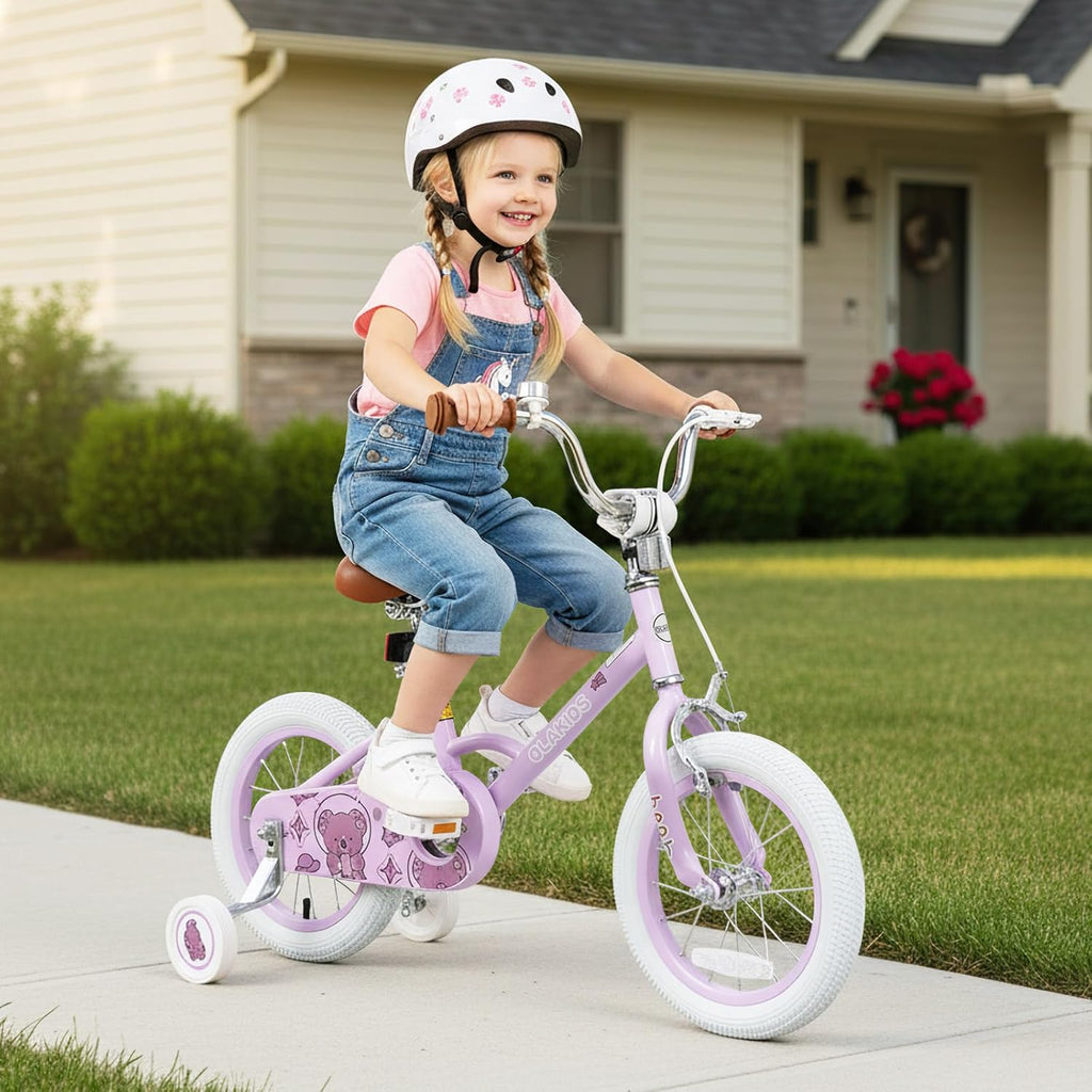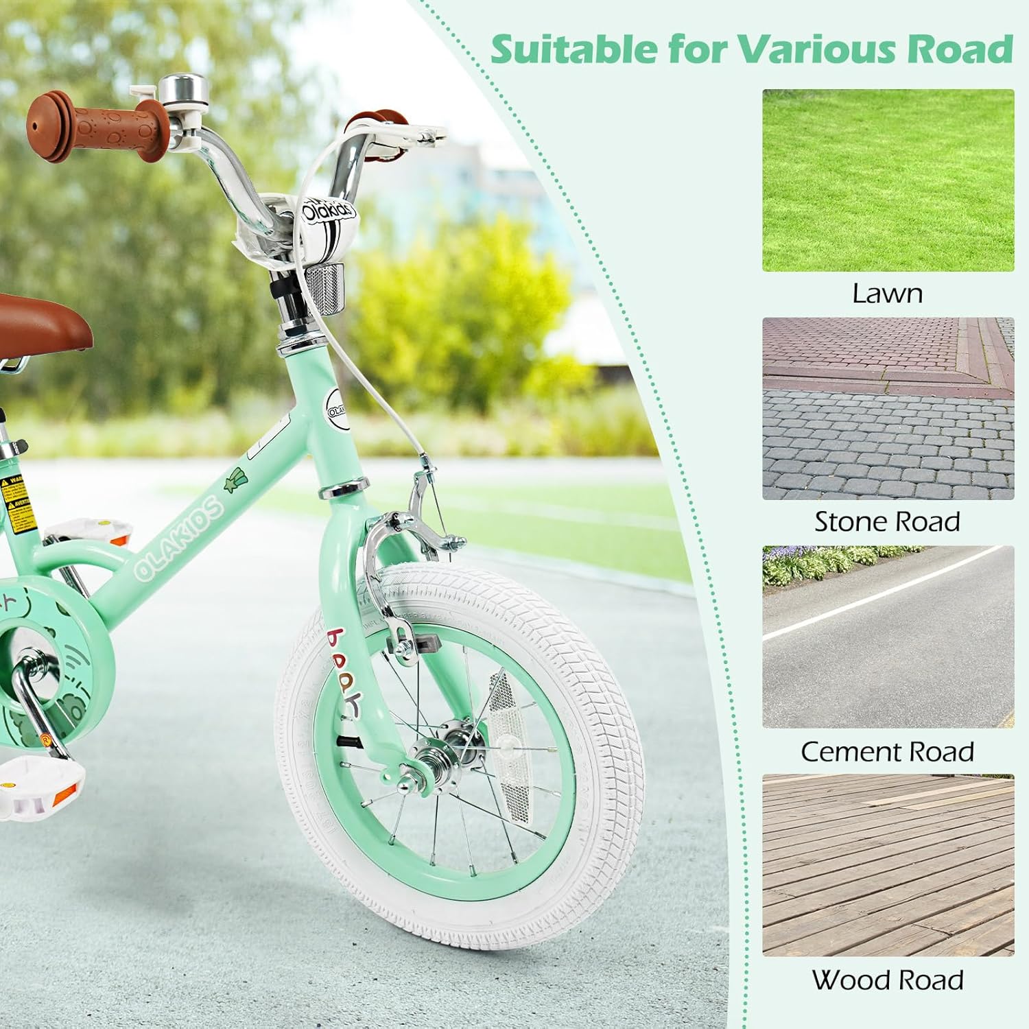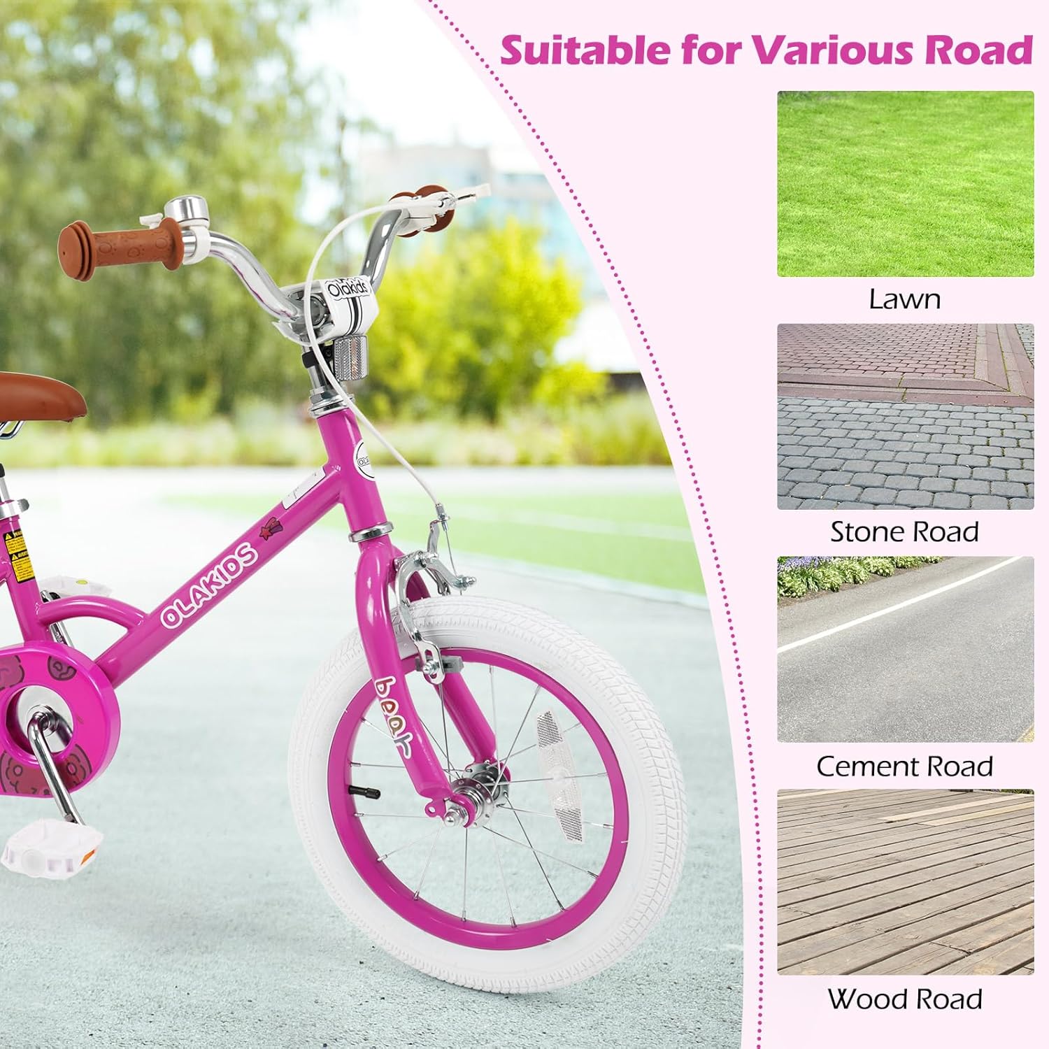Premium and Stable Materials: The frame is made of high-quality carbon steel, capable of daily use. The girls bike is paired with a comfortable foam PP seat and TRP anti-slip training wheels to enhance riding comfortable and stability. The wide rubber tires offer strong grip and can easily handle various common terrains
