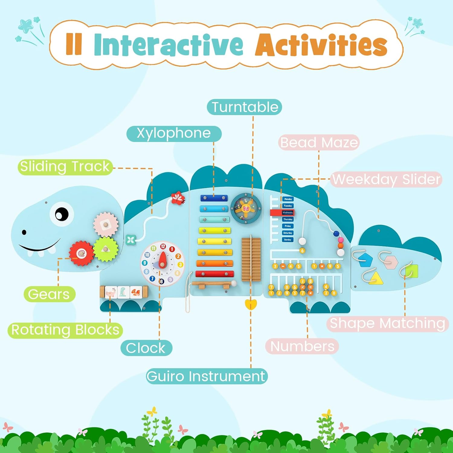 11 Interactive Activities: OLAKIDS sensory wall toys features various activities, including a clock, sliding track, xylophone, scratch board, turntable, bead maze, weekday slider, math operation slider puzzle, rotating blocks, shape matching, and gears