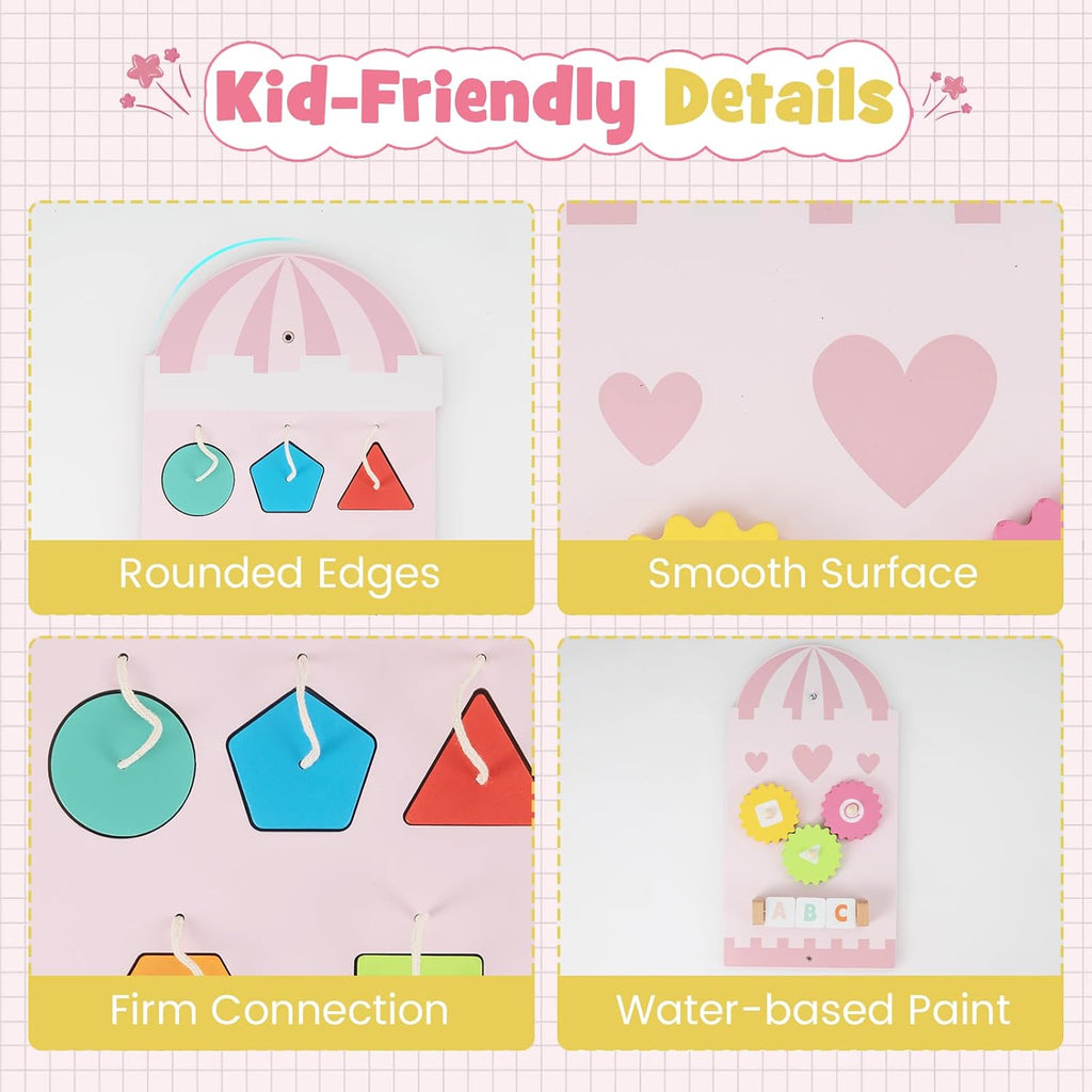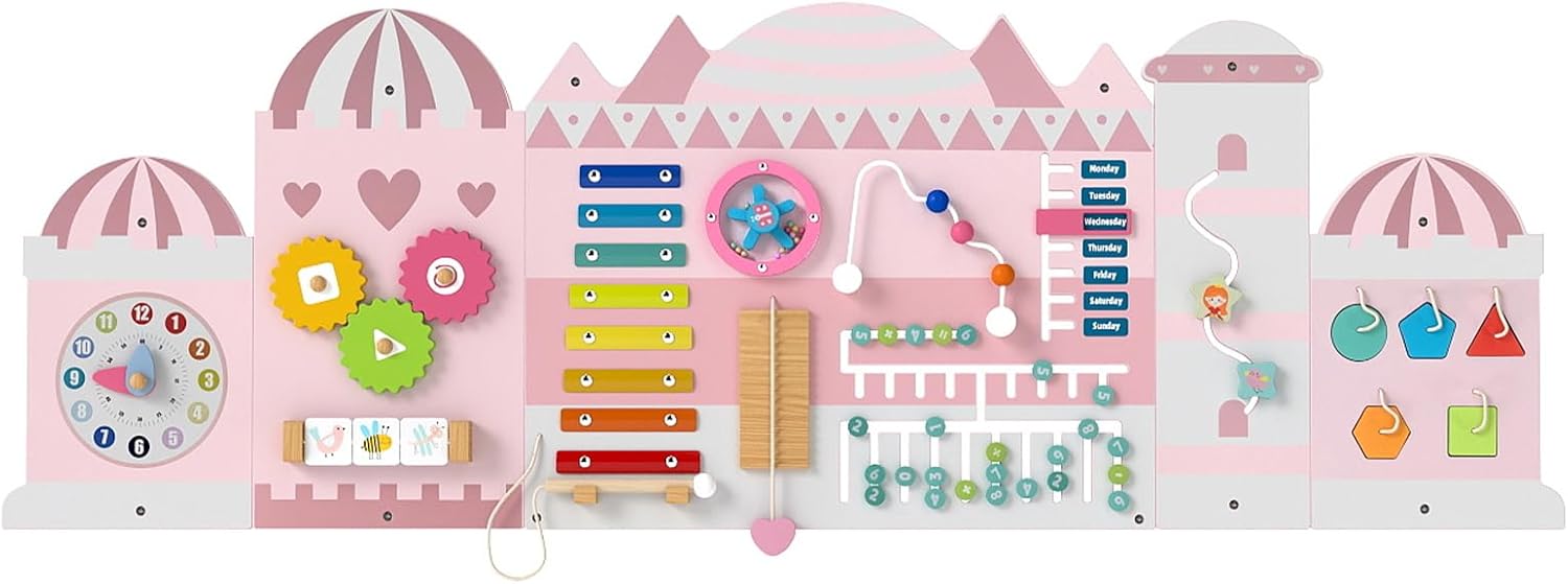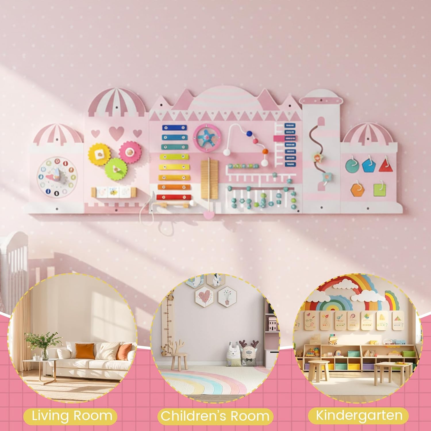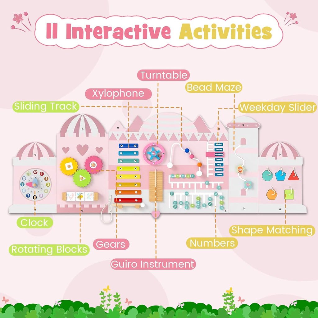 INFANS Pink Castle Sensory Wall, 11 in 1 Wooden Montessori Busy Board Panel, Toddler Wall Mounted Activity Center, Educational Toys Learning Gift for Boys Girls